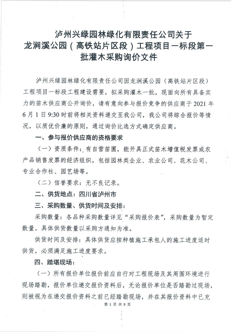龍澗溪公園(高鐵站片區(qū)段)工程項(xiàng)目一標(biāo)段第一批灌木采購(gòu)詢價(jià)文件