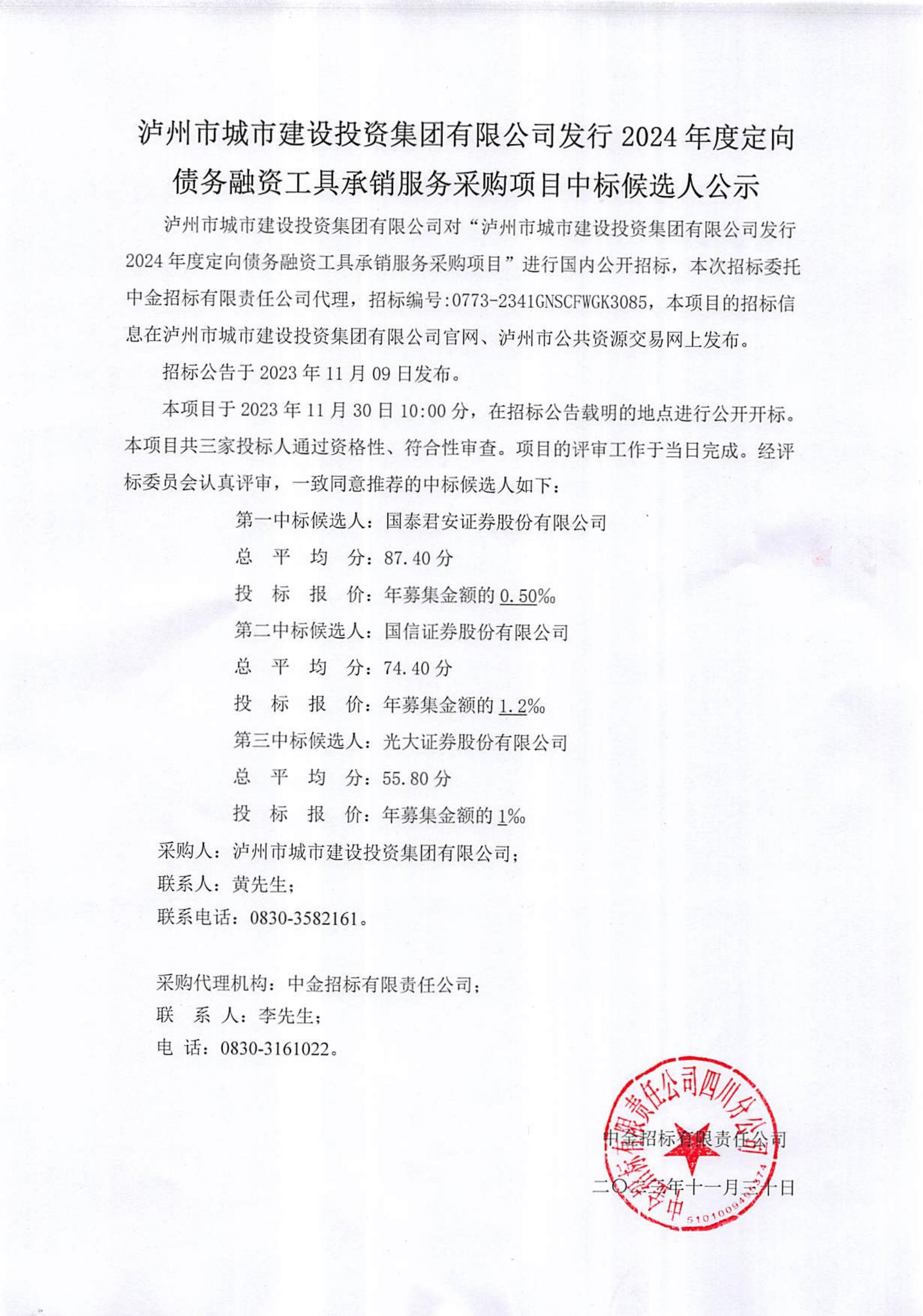 瀘州市城市建設(shè)投資集團有限公司發(fā)行2024年度定向債務(wù)融資工具承銷服務(wù)采購項目中標(biāo)候選人公示