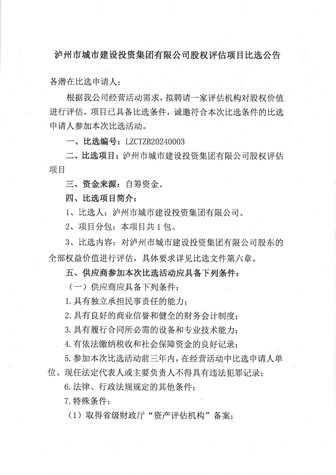 瀘州市城市建設(shè)投資集團(tuán)有限公司股權(quán)評(píng)估項(xiàng)目比選公告